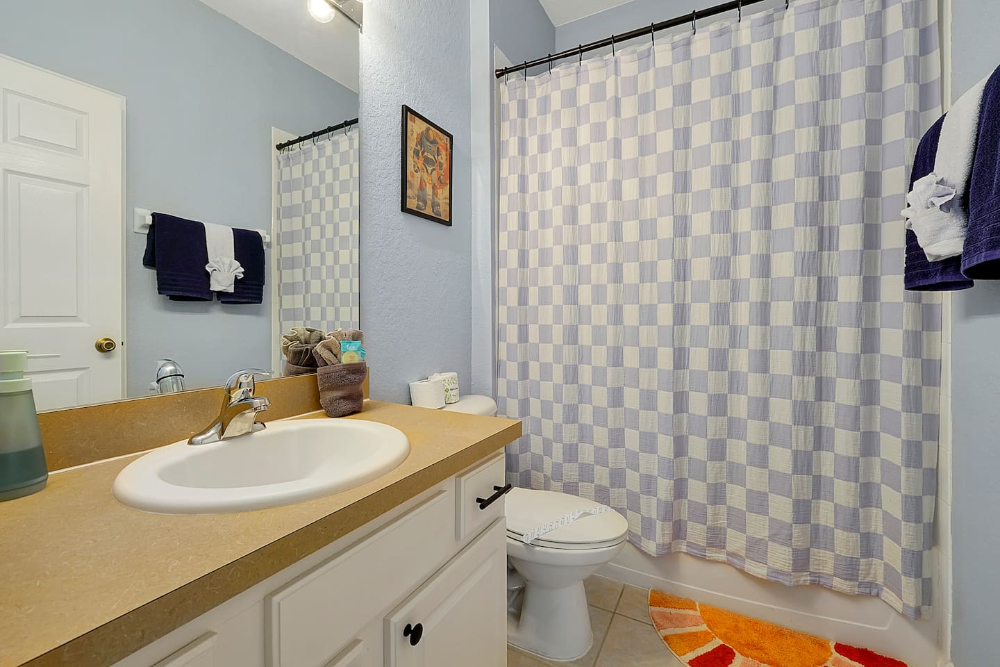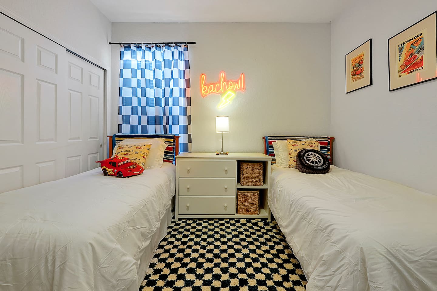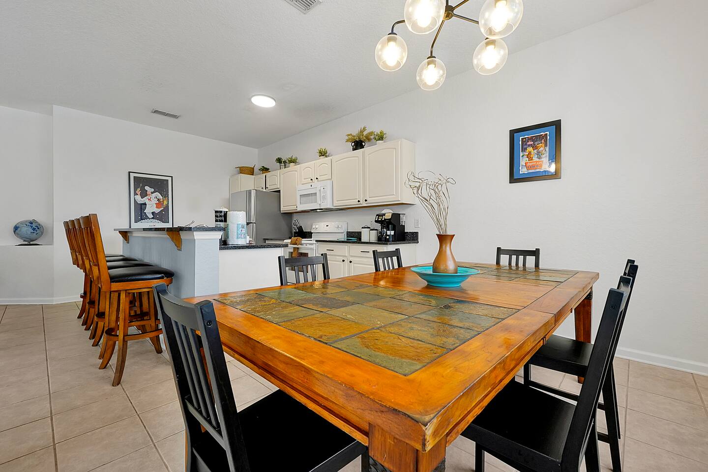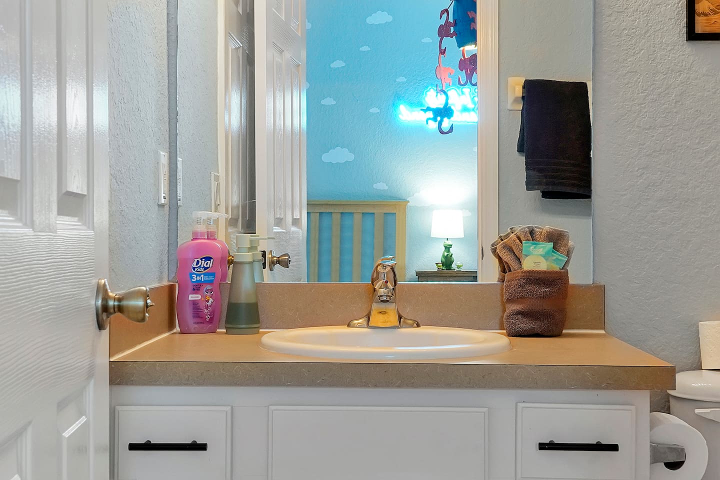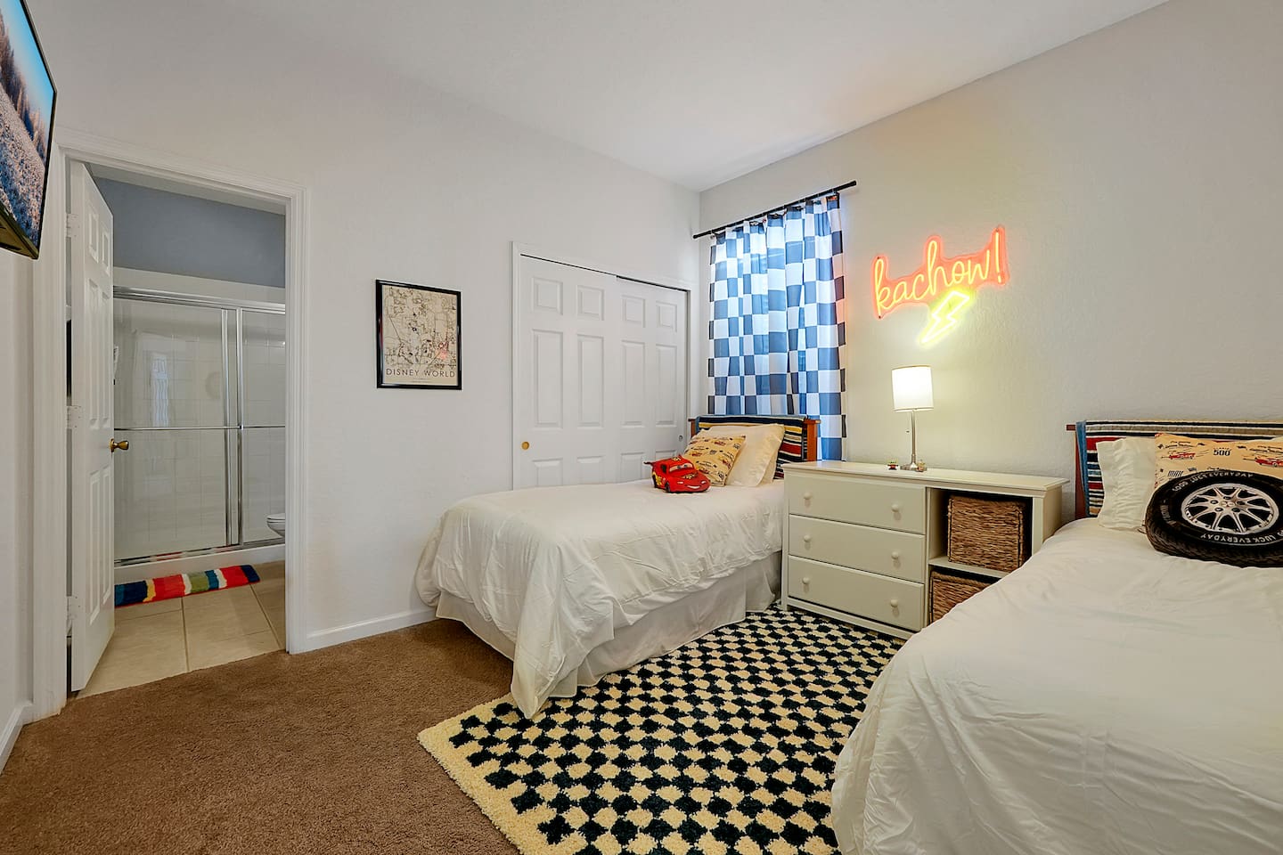 ☆☆ HIGHLIGHTS ☆☆ ✹ Sleeps 8 in a spacious family home ✹ 4 comfortable bedrooms w/ full bathrooms + flat-screen TVs; 2 kings + 4 twins ✹ Essential toiletries provided ✹ Full kitchen w/ modern appliances ✹ Breakfast bar w/ 4 high stools ✹ Bright dining area w/ 6 seats ✹ Spacious living area w/ large flat-screen TV + ample seating ✹ High-speed wifi ✹ Game room w/ full-size pool table, air hockey + foosball ✹ Washing machine + dryer ✹ Private backyard oasis w/ hot tub + sun loungers ✹ Heated Pool (between 8am to 10pm) ✹ Outdoor dining table w/ 6 seats ✹ Family-friendly; travel crib, high chair, kids’ tableware, books, toys + games ✹ Free access to Windsor Hills Resort amenities; clubhouse, pool, water park, gym + more ✹ Free parking for three vehicles ✹ Complete privacy thanks to no rear neighbors ✹ Professional cleaning service available (additional fee applies) ✹ Perfect location w/ easy access to local attractions; short drive to restaurants + groceries Eager to Read More? Here Are A Few Kind Words From Our Previous Guests: “Very happy with the house and loved that the floorplan had a bathroom for each room! Kids loved that each bedroom had TVs ! Cute Disney details- great heated pool for swimming.” –Kelly “We had a great time at Sharmin’s place. Sharmin is very responsive and accommodating. My friends and I do this every year and this has been our favorite space so far. It was extremely clean, all on one level and the privacy and proximity to restaurants and shopping was great. We would definitely book again.” –Lori “Sharmin’s place was beyond what we anticipated. It is in a gated community with access to the community amenities. From door to parking at the Magic Kingdom is less than 15 minutes unless the traffic is backed up. The pool and hot tub were both clean and well kept. Daily trash pick up! Four bedrooms, four bathrooms, a large living/dining/kitchen area. On top of all that, Sharmin is a proactive host who will practically guide you through the process from pre-checkin through checkout. Our next Disney trip will include a stay at Sharmin’s place again.” –Jackie ★★ BEDROOMS ★★ Each bedroom has a private bathroom and a TV for the ultimate privacy and convenience after a full day of exploring Florida’s top attractions. Little ones will adore the Disney-themed bedrooms, with comfortable twin beds for giggle-filled slumber parties. All four bedrooms have ample space to store your belongings so you feel right at home. ✹ Primary Bedroom: King-sized bed + ensuite bathroom ✹ Bedroom 2: King-sized bed + private bathroom ✹ Bedroom 3: 2 twin-sized beds, toys + ensuite bathroom ✹ Bedroom 4: 2 twin-sized beds, toys + full bathroom ✔ Dressers and closets ✔ Flat-screen TV in each bedroom ★★ BATHROOMS ★★ Each bedroom has an attached bathroom; two have a bathtub/shower unit and two have spacious walk-in showers. All bathrooms are squeaky clean, with plenty of fresh towels and complimentary toiletries for you to freshen up comfortably. ✹ Bathroom 1: Ensuite to primary bedroom w/ a huge walk-in shower ✹ Bathroom 2: Full bathroom to second bedroom w/ a bathtub/shower combo ✹ Bathroom 3: Full bath to third bedroom w/ a bath/shower unit ✹ Bathroom 4: Private bathroom to fourth bedroom w/ a walk-in shower ✔ Essential toiletries provided (including shampoo + body wash) ✔ Hair dryer ✔ Fresh towels ★★ KITCHEN & DINING ★★ The spacious kitchen is bright, modern, and fully equipped with everything you need to whip up delicious meals for the whole family. Brew a fresh coffee before tackling the theme park crowds, enjoy a light bite at the breakfast bar, or savor a family meal in the formal dining area. Easy access to the outdoor oasis and a lanai for shelter means you can enjoy outdoor dining anytime. ✔ Fully stocked kitchen w/ modern appliances (including induction refrigerator, microwave + electric stove) ✔ Complimentary coffee bar ✔ Basic cookware + dinnerware (including brand-new pots and pans) ✔ Large dining table w/ seating for 6 ✔ Breakfast bar w/ 4 seats ✔ High chair for kids ★★ LIVING ROOM ★★ A perfect blend of vibrant decor, beautiful natural light, and cozy couches create a comfortable family living space. Wind down from a busy day with a family movie, curl up with a good book, or plan your next adventure. Easy access to the private backyard allows you to enjoy the famous Florida sunshine. ✔ Large flat-screen TV ✔ 2 plush couches ✔ Pack ‘n Play ✔ Tons of books for kids + big kids ★★ GAME ROOM ★★ The fun-filled game room is the perfect place for guests of all ages to enjoy some friendly competition. Shoot some pool, have a foosball match, or try your hand at air hockey. A convenient laundry station is also available so you can freshen up your clothing between excursions. ✔ Pool, foosball + air hockey tables ✔ Full-sized washing machine + dryer ✔ Kids’ toys/games ★★ OUTDOOR SPACE ★★ Surrounded by lush green space, the backyard haven is the perfect retreat from the theme park crowds. Take a refreshing dip in the sparkling, heated pool. Sink into the bubbling hot tub with a cool drink. Relax over cocktails and nibbles, sheltered from the elements beneath the glass lanai. For a change of scenery, head to the resort clubhouse to enjoy the various sports facilities and water parks. ✔ Fenced-in backyard with no rear neighbors ✔ Heated outdoor pool w/ jacuzzi (complimentary heating) ✔ Lounge furniture + outdoor dining table w/ 6 seats ✔ Pool safety fence ✔ Inclusive access to Windsor Hill Resort amenities ★★ ACTIVITIES/ATTRACTIONS ★★ Kissimmee is well-known for its family-friendly attractions, restaurants, and destination shopping, and our home offers both proximity and tranquility. Check out some of the fun waiting on your doorstep: Family-Friendly Attractions ✔ Walt Disney World Resort (3 miles) ✔ Fun Spot Am