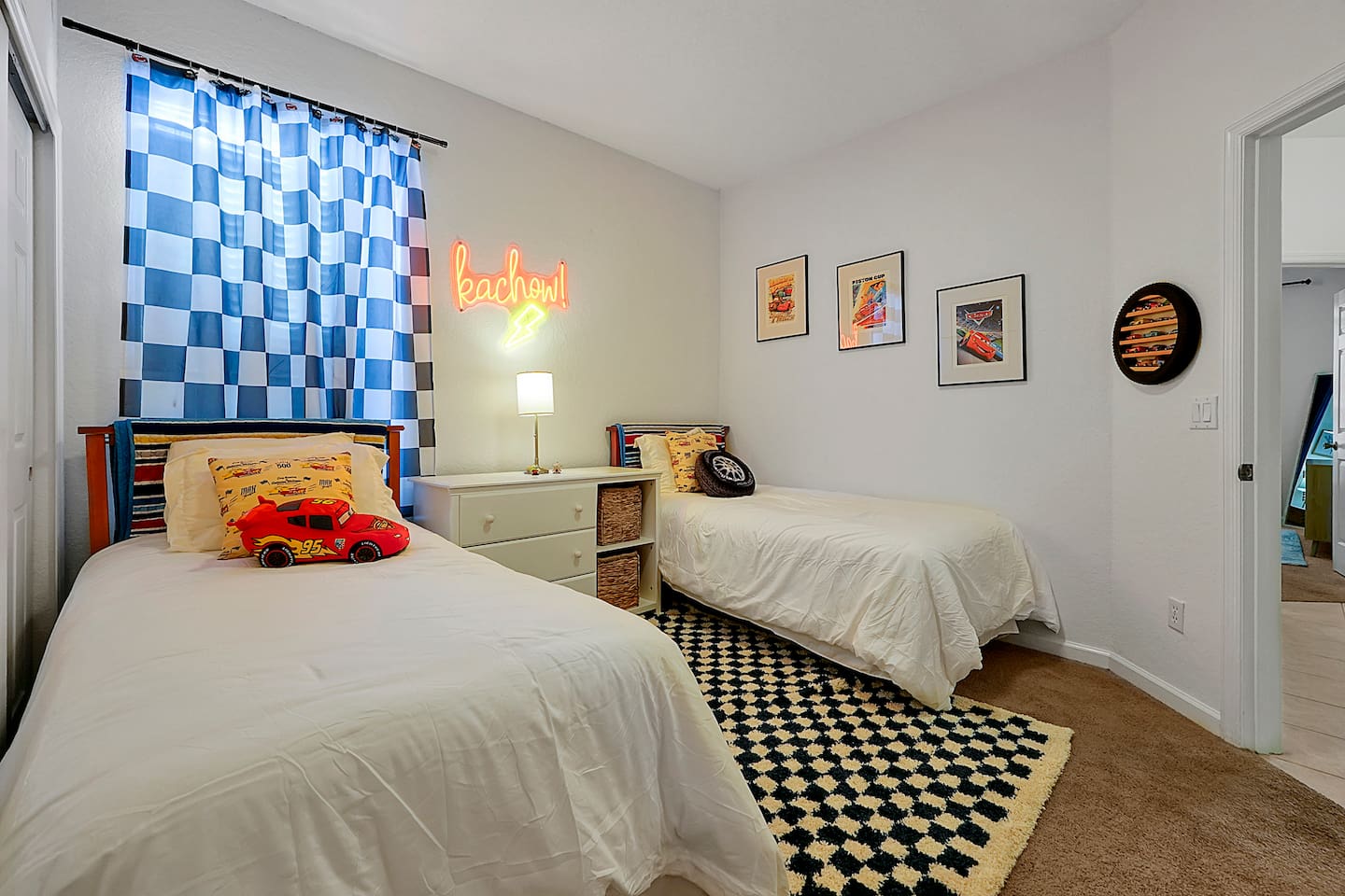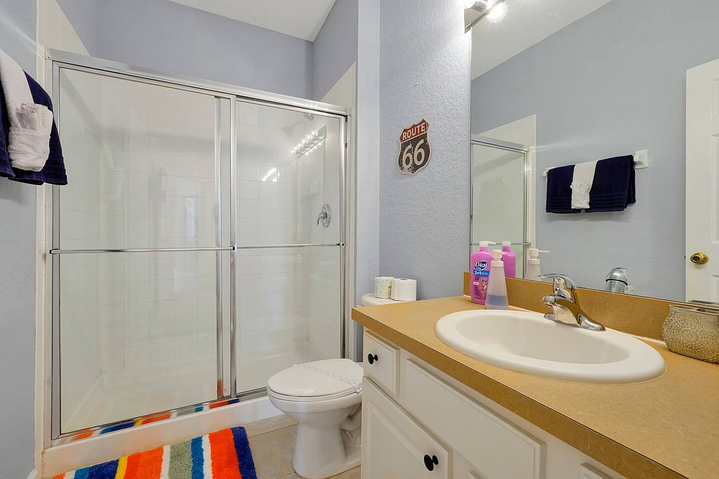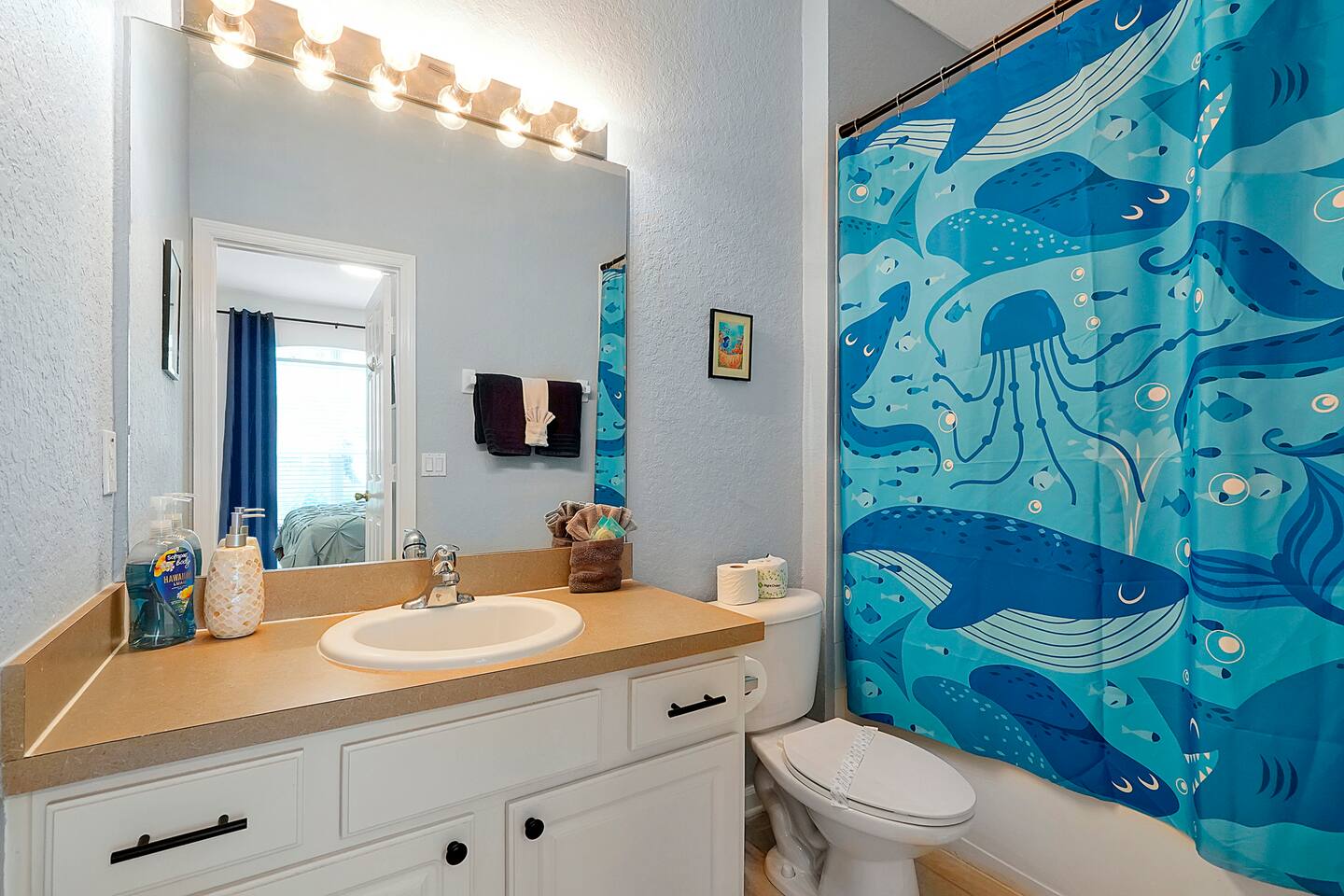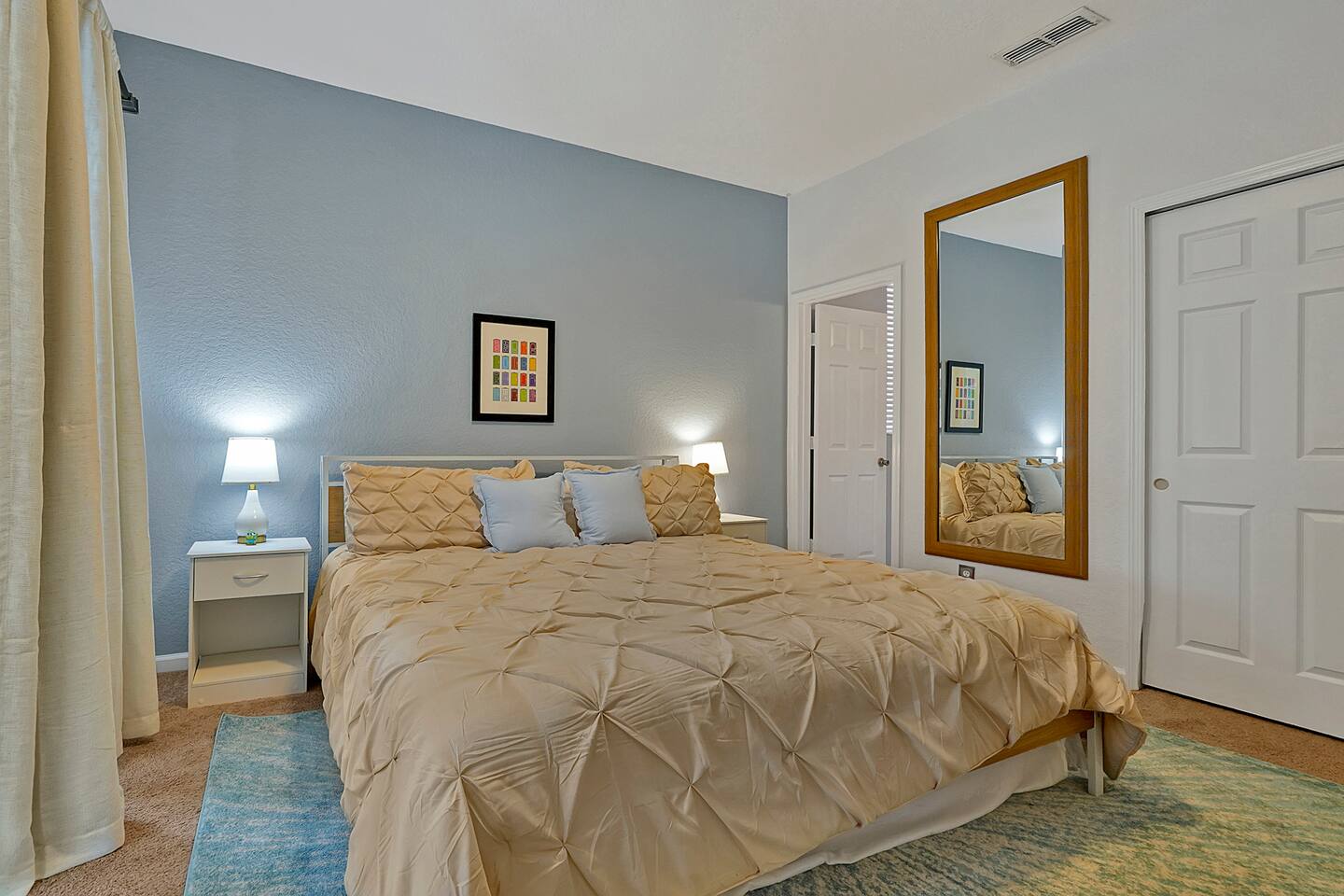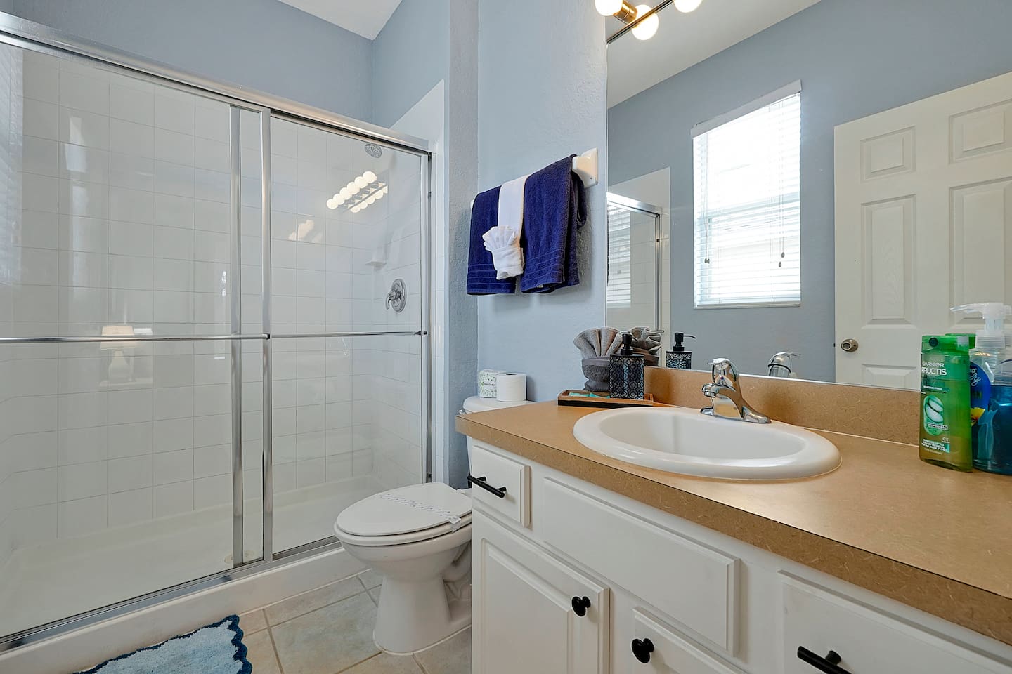 ☆☆ HIGHLIGHTS ☆☆ ✹ Sleeps 8 in a spacious family home ✹ 4 comfortable bedrooms w/ full bathrooms + flat-screen TVs; 2 kings + 4 twins ✹ Essential toiletries provided ✹ Full kitchen w/ modern appliances ✹ Breakfast bar w/ 4 high stools ✹ Bright dining area w/ 6 seats ✹ Spacious living area w/ large flat-screen TV + ample seating ✹ High-speed wifi ✹ Game room w/ full-size pool table, air hockey + foosball ✹ Washing machine + dryer ✹ Private backyard oasis w/ hot tub + sun loungers ✹ Heated Pool (between 8am to 10pm) ✹ Outdoor dining table w/ 6 seats ✹ Family-friendly; travel crib, high chair, kids’ tableware, books, toys + games ✹ Free access to Windsor Hills Resort amenities; clubhouse, pool, water park, gym + more ✹ Free parking for three vehicles ✹ Complete privacy thanks to no rear neighbors ✹ Professional cleaning service available (additional fee applies) ✹ Perfect location w/ easy access to local attractions; short drive to restaurants + groceries Eager to Read More? Here Are A Few Kind Words From Our Previous Guests: “Very happy with the house and loved that the floorplan had a bathroom for each room! Kids loved that each bedroom had TVs ! Cute Disney details- great heated pool for swimming.” –Kelly “We had a great time at Sharmin’s place. Sharmin is very responsive and accommodating. My friends and I do this every year and this has been our favorite space so far. It was extremely clean, all on one level and the privacy and proximity to restaurants and shopping was great. We would definitely book again.” –Lori “Sharmin’s place was beyond what we anticipated. It is in a gated community with access to the community amenities. From door to parking at the Magic Kingdom is less than 15 minutes unless the traffic is backed up. The pool and hot tub were both clean and well kept. Daily trash pick up! Four bedrooms, four bathrooms, a large living/dining/kitchen area. On top of all that, Sharmin is a proactive host who will practically guide you through the process from pre-checkin through checkout. Our next Disney trip will include a stay at Sharmin’s place again.” –Jackie ★★ BEDROOMS ★★ Each bedroom has a private bathroom and a TV for the ultimate privacy and convenience after a full day of exploring Florida’s top attractions. Little ones will adore the Disney-themed bedrooms, with comfortable twin beds for giggle-filled slumber parties. All four bedrooms have ample space to store your belongings so you feel right at home. ✹ Primary Bedroom: King-sized bed + ensuite bathroom ✹ Bedroom 2: King-sized bed + private bathroom ✹ Bedroom 3: 2 twin-sized beds, toys + ensuite bathroom ✹ Bedroom 4: 2 twin-sized beds, toys + full bathroom ✔ Dressers and closets ✔ Flat-screen TV in each bedroom ★★ BATHROOMS ★★ Each bedroom has an attached bathroom; two have a bathtub/shower unit and two have spacious walk-in showers. All bathrooms are squeaky clean, with plenty of fresh towels and complimentary toiletries for you to freshen up comfortably. ✹ Bathroom 1: Ensuite to primary bedroom w/ a huge walk-in shower ✹ Bathroom 2: Full bathroom to second bedroom w/ a bathtub/shower combo ✹ Bathroom 3: Full bath to third bedroom w/ a bath/shower unit ✹ Bathroom 4: Private bathroom to fourth bedroom w/ a walk-in shower ✔ Essential toiletries provided (including shampoo + body wash) ✔ Hair dryer ✔ Fresh towels ★★ KITCHEN & DINING ★★ The spacious kitchen is bright, modern, and fully equipped with everything you need to whip up delicious meals for the whole family. Brew a fresh coffee before tackling the theme park crowds, enjoy a light bite at the breakfast bar, or savor a family meal in the formal dining area. Easy access to the outdoor oasis and a lanai for shelter means you can enjoy outdoor dining anytime. ✔ Fully stocked kitchen w/ modern appliances (including induction refrigerator, microwave + electric stove) ✔ Complimentary coffee bar ✔ Basic cookware + dinnerware (including brand-new pots and pans) ✔ Large dining table w/ seating for 6 ✔ Breakfast bar w/ 4 seats ✔ High chair for kids ★★ LIVING ROOM ★★ A perfect blend of vibrant decor, beautiful natural light, and cozy couches create a comfortable family living space. Wind down from a busy day with a family movie, curl up with a good book, or plan your next adventure. Easy access to the private backyard allows you to enjoy the famous Florida sunshine. ✔ Large flat-screen TV ✔ 2 plush couches ✔ Pack ‘n Play ✔ Tons of books for kids + big kids ★★ GAME ROOM ★★ The fun-filled game room is the perfect place for guests of all ages to enjoy some friendly competition. Shoot some pool, have a foosball match, or try your hand at air hockey. A convenient laundry station is also available so you can freshen up your clothing between excursions. ✔ Pool, foosball + air hockey tables ✔ Full-sized washing machine + dryer ✔ Kids’ toys/games ★★ OUTDOOR SPACE ★★ Surrounded by lush green space, the backyard haven is the perfect retreat from the theme park crowds. Take a refreshing dip in the sparkling, heated pool. Sink into the bubbling hot tub with a cool drink. Relax over cocktails and nibbles, sheltered from the elements beneath the glass lanai. For a change of scenery, head to the resort clubhouse to enjoy the various sports facilities and water parks. ✔ Fenced-in backyard with no rear neighbors ✔ Heated outdoor pool w/ jacuzzi (complimentary heating) ✔ Lounge furniture + outdoor dining table w/ 6 seats ✔ Pool safety fence ✔ Inclusive access to Windsor Hill Resort amenities ★★ ACTIVITIES/ATTRACTIONS ★★ Kissimmee is well-known for its family-friendly attractions, restaurants, and destination shopping, and our home offers both proximity and tranquility. Check out some of the fun waiting on your doorstep: Family-Friendly Attractions ✔ Walt Disney World Resort (3 miles) ✔ Fun Spot Am